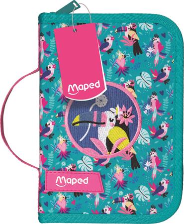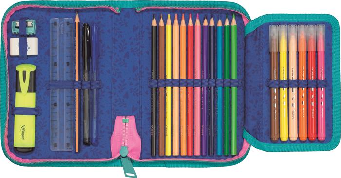 Töltött tolltartó divatos mintával, amely minden szükséges írószert tartalmaz a tanórákhoz. Praktikus kialakításának köszönhetően a ceruzák, radírok, ollók és egyéb eszközök átláthatóan rendszerezhetők benne.