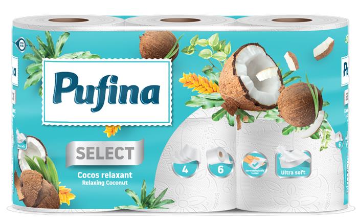Toalettpapír, 4 rétegű, kistekercses, 6 tekercs, PUFINA „Relaxing Coconut”, kókusz illattal