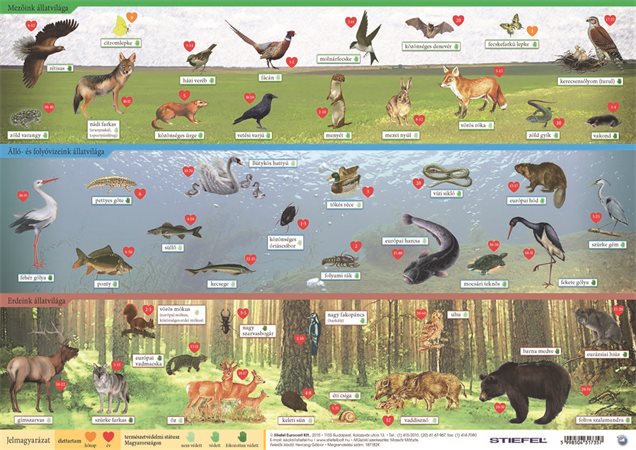 A Magyarország vadon élő állatai két oldalas alátétünk a három fő élőhely – mezők, vizek, erdők – szerint mutatja be hazánk állatvilágát a legapróbb részletekig élethű, eredeti rajzokon. Az apró állatrajzok mellett a gyerekek számára könnyen értelmezhető piktogramok szemléltetik az állatok élettartamát és védettségét Magyarországon. Az alátéten helyet kaptak a sokak által ismert, „egyszerű” állatok, mint a nyúl vagy a róka, de olyan fajok is, amelyek őshonosak lévén, valaha jelen voltak hazánkban, majd a kihalás szélére kerültek, és az utóbbi évtizedekben újra megjelentek – mint a hiúz, vagy a barnamedve. Az alátét másik oldala hazánk térképén érdekesen szemlélteti, merre bukkantak fel mostanában a ritka fajok, továbbá pontos információval szolgál Magyarország összes állatkertjének, vadasparkjának és akváriumának hollétéről is.